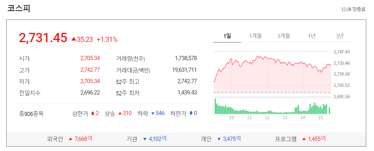 오늘 코스피는 지난 달 말일 MSCI 지수 재조정으로 추정되는 외국인의 대량 매도 이후 4일 연속 순매수가 들어오면서 어제보다 35.23포인트(1.31%) 오른 2731.45를 기록했습니다. 종가 기준으로도 역대 최고지만, 장중 2742.77포인트까지 상승하면서 장중 사상 최고치도 갈아치웠습니다.