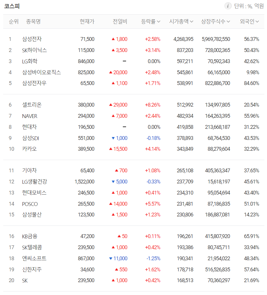 오늘 외국인 순매수 상위종목은 셀트리온, 삼성전자, 카카오, 삼성바이오로직스, LG화학 등이고 순매도 종목에는 삼성전자우, 삼성SDI, 엔씨소프트, DB하이텍, LG생활건강 등이 이름을 올렸습니다.