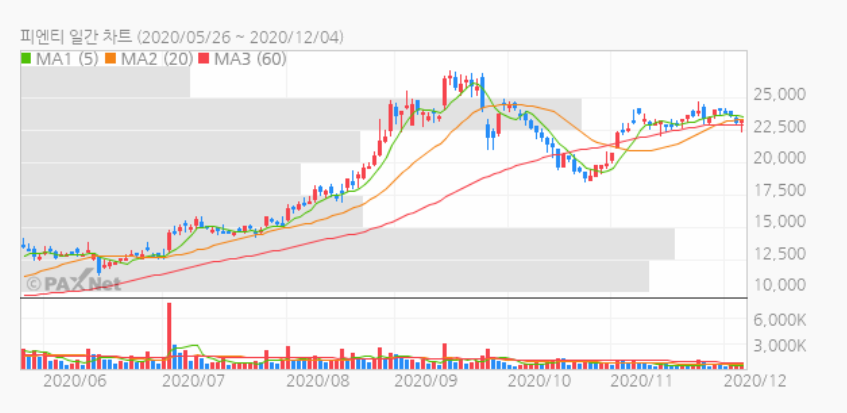 지난 3분기 피엔티는 매출액 661억 원, 영업이익 93억 원을 기록하면서 전년 동기 대비 -23% 매출 감소가 있으나 연간 누적으로는 -5.3% 감소로 올해 코로나19로 인한 경기 침체를 감안할 때 좋은 실적을 거뒀다고 할 수 있습니다.