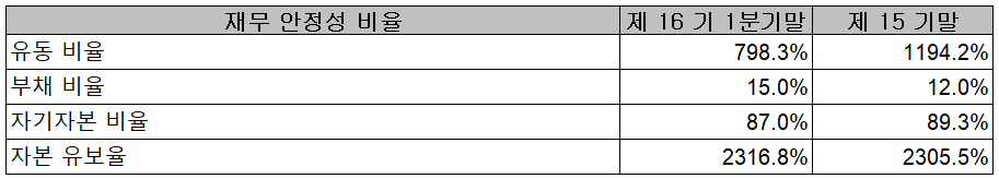 당사의 재무 안정성 비율에서는 유동비율 798.3%, 부채비율 15%, 자기자본비율 87%, 자본 유보율 2,316.8%를 기록하면서 풍부한 유동성과 함께 안정적인 재무상태를 유지하고 있습니다.