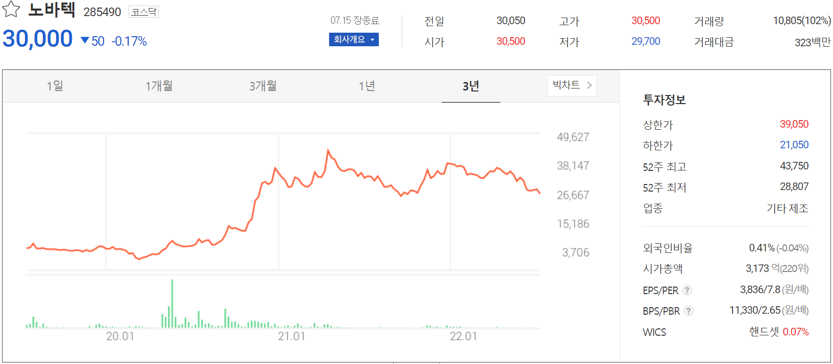 7월 15일 장 종료 기준 당사의 주가는 전 거래일보다 0.17% 내린 30,000원에 거래를 마감했습니다. 외국인 비중은 0.41%이며 시가총액 3,173억 원으로 코스닥 시총 기준 220위 종목입니다.