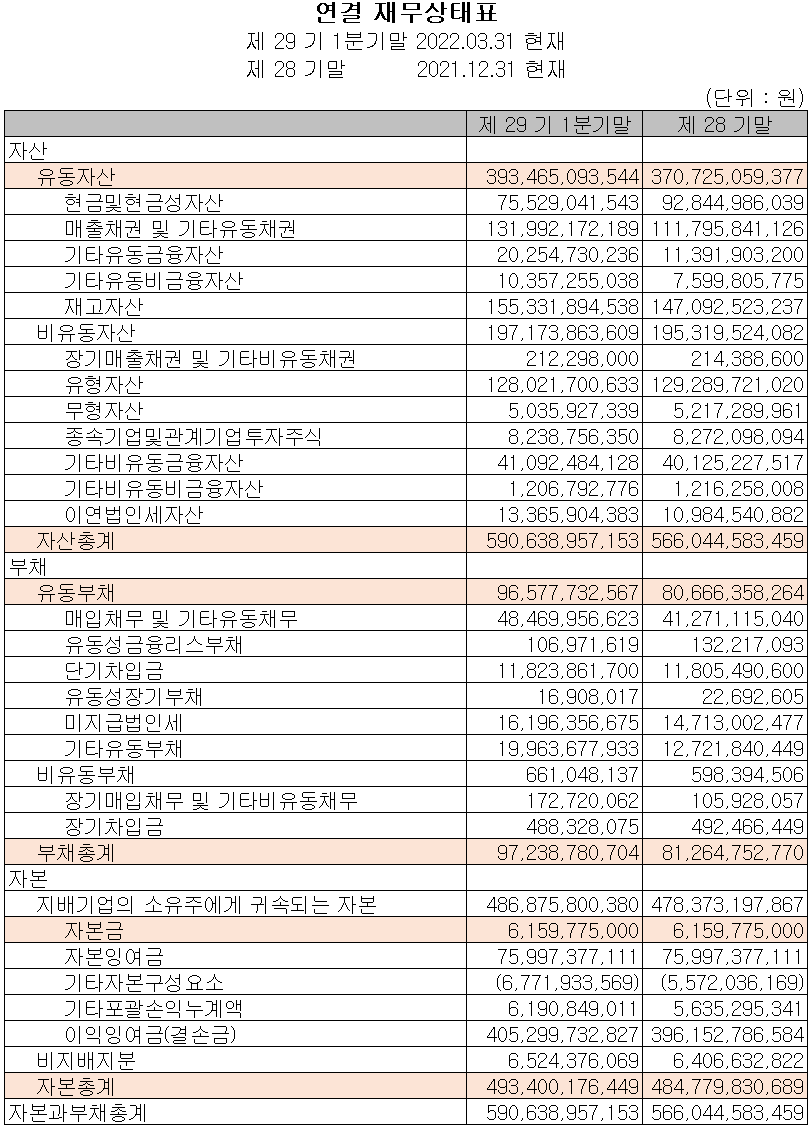 2022년 1분기 총자산은 전기 대비 4.3%(246억) 증가한 5,906억 원으로 매출채권, 금융자산 및 재고자산 등의 증가에 기인합니다. 부채총계는 19.7%(160억) 늘어난 972억 원으로 매입채무 및 기타 유동부채의 증가에 따릅니다. 자본총계는 미지급 배당금의 대체로 유출이 있으나, 당기순이익의 발생으로 총 1.8% 증가한 4,934억 원을 기록했습니다.
