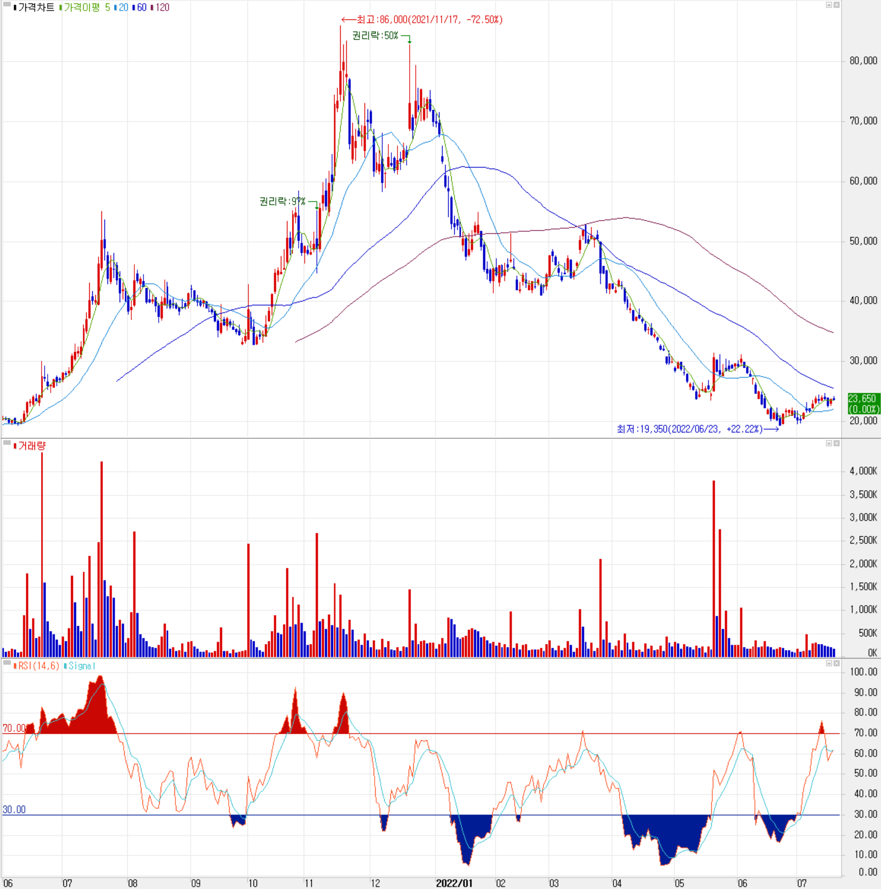 7월 19일 장 종료 기준 당사의 주가는 전 거래일 종가와 같은 23,650원에 거래를 마감했습니다. 외국인 비율은 3.08%이며, 시가 총액 5,164억 원으로 코스닥 시총 기준 120위 종목입니다.