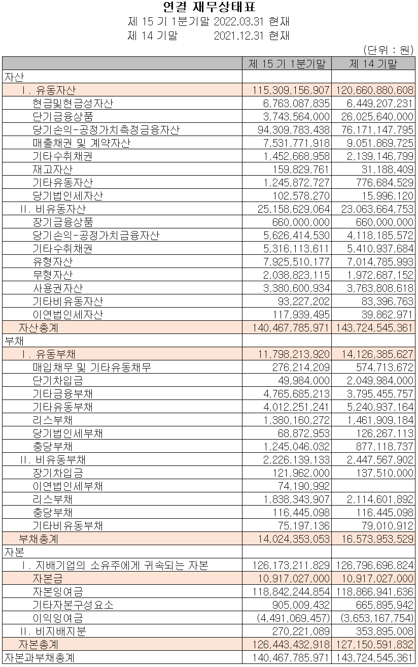 2022년 1분기 총자산은 전기 대비 2.3% 감소한 1,405억 원이며, 부채총계는 15.4%(25억) 줄어든 140억 원으로 단기차입금 및 기타유동부채의 감소에 기인합니다. 자본총계는 당기순손실의 발생으로 0.6% 감소한 1,264억 원을 기록했습니다.