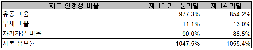 당사의 재무 안정성 비율에서는 유동비율 977.3%, 부채비율 11.1%, 자기자본비율 90%, 자본 유보율 1,047.5%를 기록하면서 양호한 재무상태를 유지하고 있습니다.