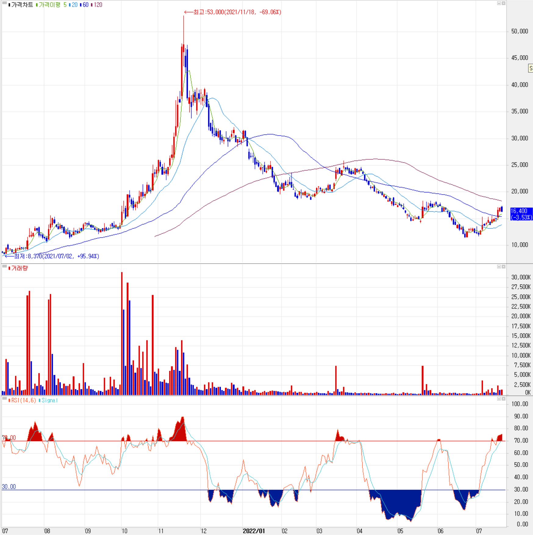 7월 20일 장 종료 기준 당사의 주가는 전일보다 3.53% 내린 16,400원에 거래를 마쳤습니다. 외국인 비중은 0.75%이며 시가총액 4,167억 원으로 코스닥 시총 기준 161위 종목입니다.