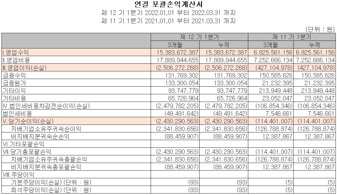 2022년 1분기 실적은 매출액 154억 원으로 전년 동기 대비 125.4% 증가했으며, 영업손실 25억 원과 당기순손실 24억 원으로 적자 지속입니다. 영화 VFX 제작 수주를 주력 사업으로 하는 당사는 코로나19 팬데믹으로 인해 어려움을 겪었으나, 일상 회복과 함께 영화 산업이 활기를 찾으면서 매출 성장과 함께 점진적인 수익성 개선도 예상됩니다.