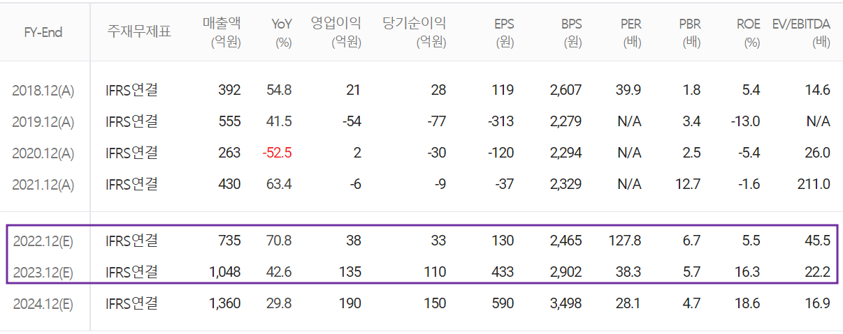 올해 당사의 예상 실적은 매출액 735억 원으로 전년 대비 70.8% 증가하고, 영업이익은 38억 원으로 흑자 전환할 것으로 추정했습니다. 2023년에는 매출액 1,048억 원으로 2022년 대비 42.6% 증가하고, 영업이익은 135억 원으로 255.2% 증가할 것으로 전망했습니다. 영화 VFX 제작 수주를 주력 사업으로 하는 당사는 코로나19 팬데믹으로 인해 어려움을 겪었으나, 일상 회복과 함께 영화 산업이 회복하고 있으며 비대면 시대에서 VFX를 기반으로 한 게임산업 등 다양한 산업과의 비즈니스를 통해 새로운 활로를 개척하고 있어 당사의 꾸준한 성장에 예상됩니다.