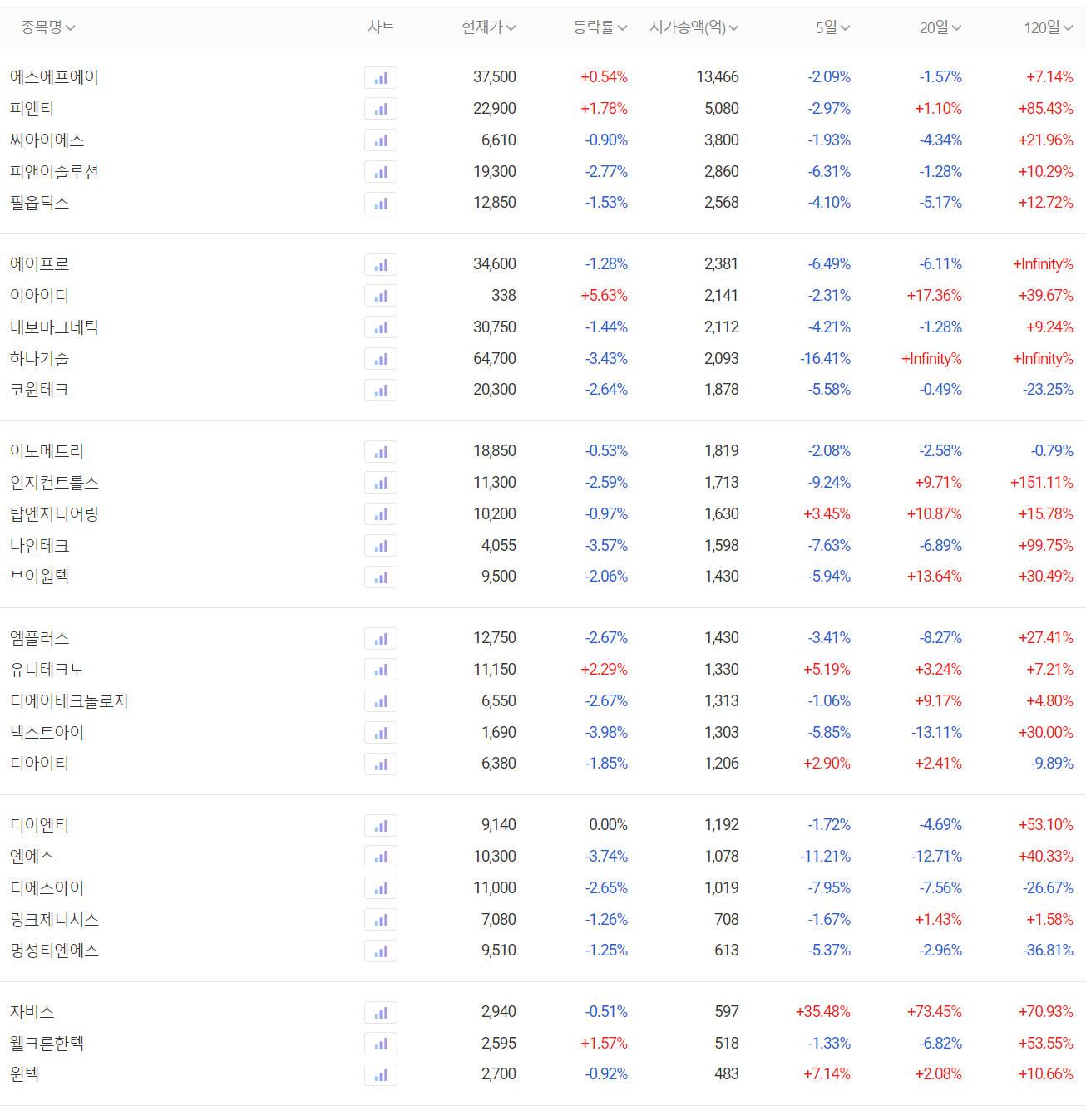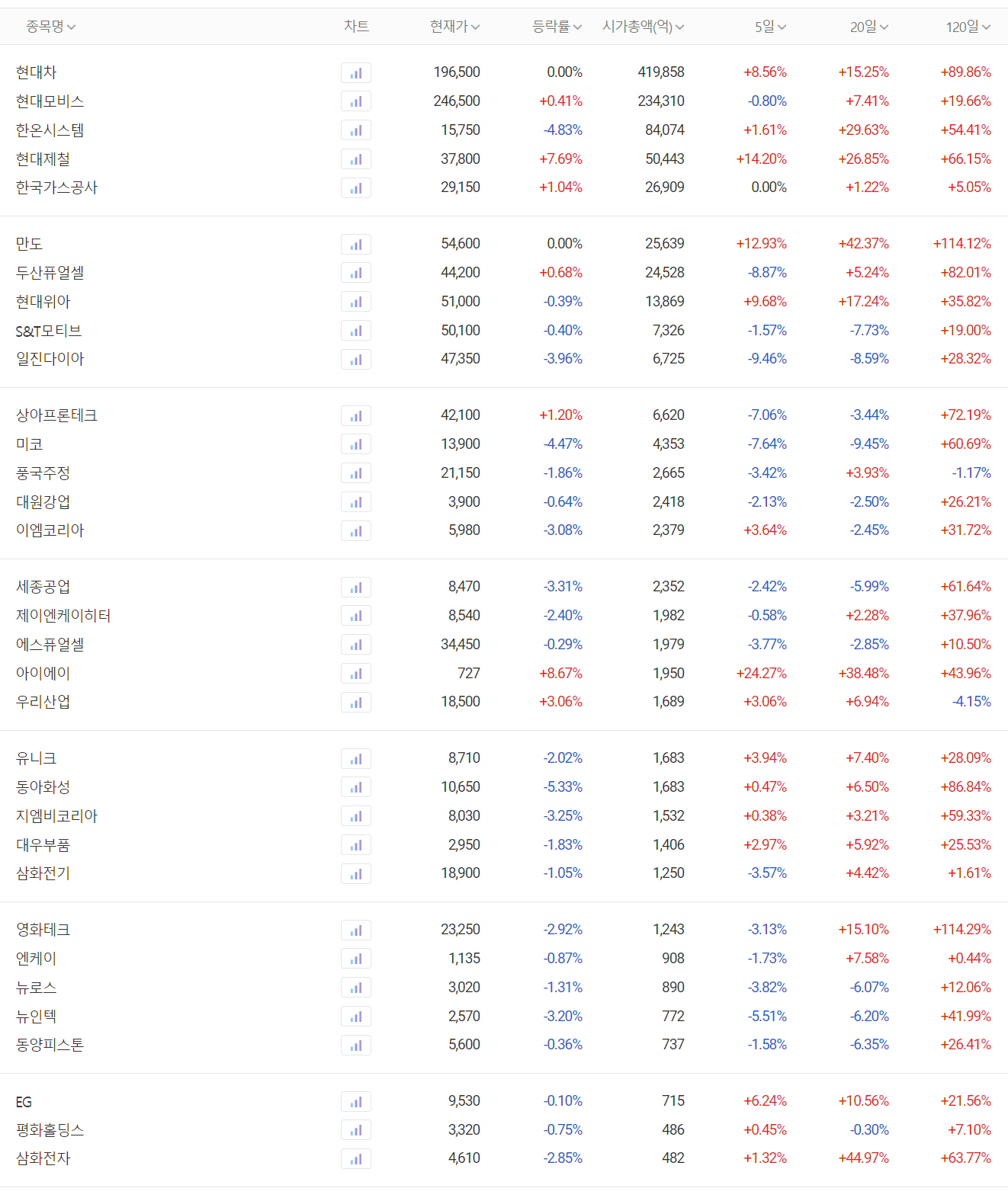 수소차 관련 종목에서는 특이사항이 없습니다. 현대제철(+14.20%)은 철강업 회복 기대감으로, 아이에이(+24.27%)는 반도체 장비주로서 상승했습니다.