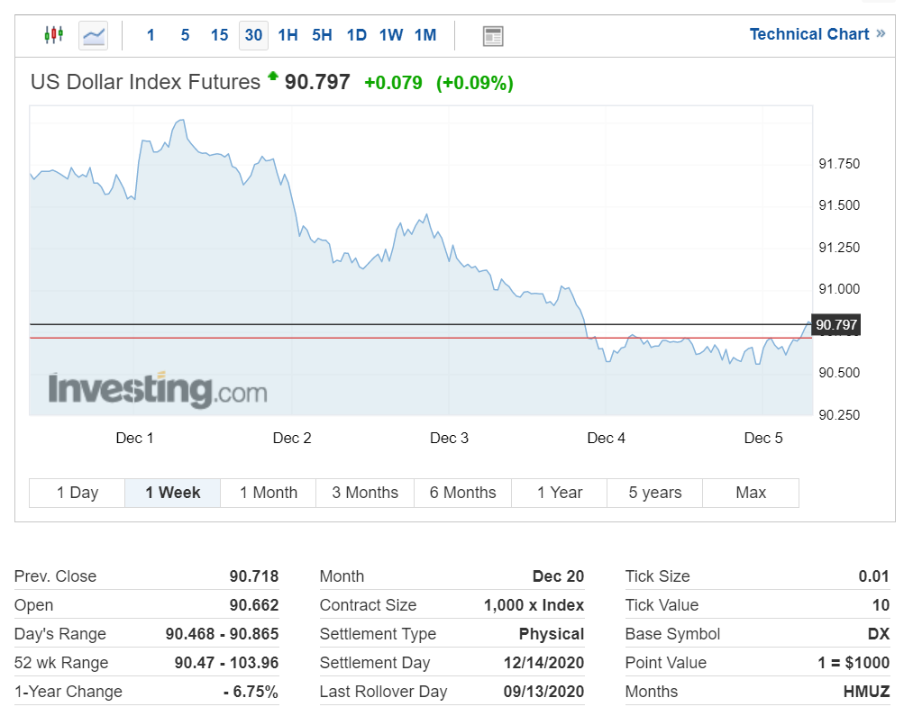 주요 6개국 통화를 기준으로 하는 미국 달러 인덱스도 일주일 내내 하락세를 이어가면서 현재 90.797을 기록, 90선 아래를 내다보고 있습니다.