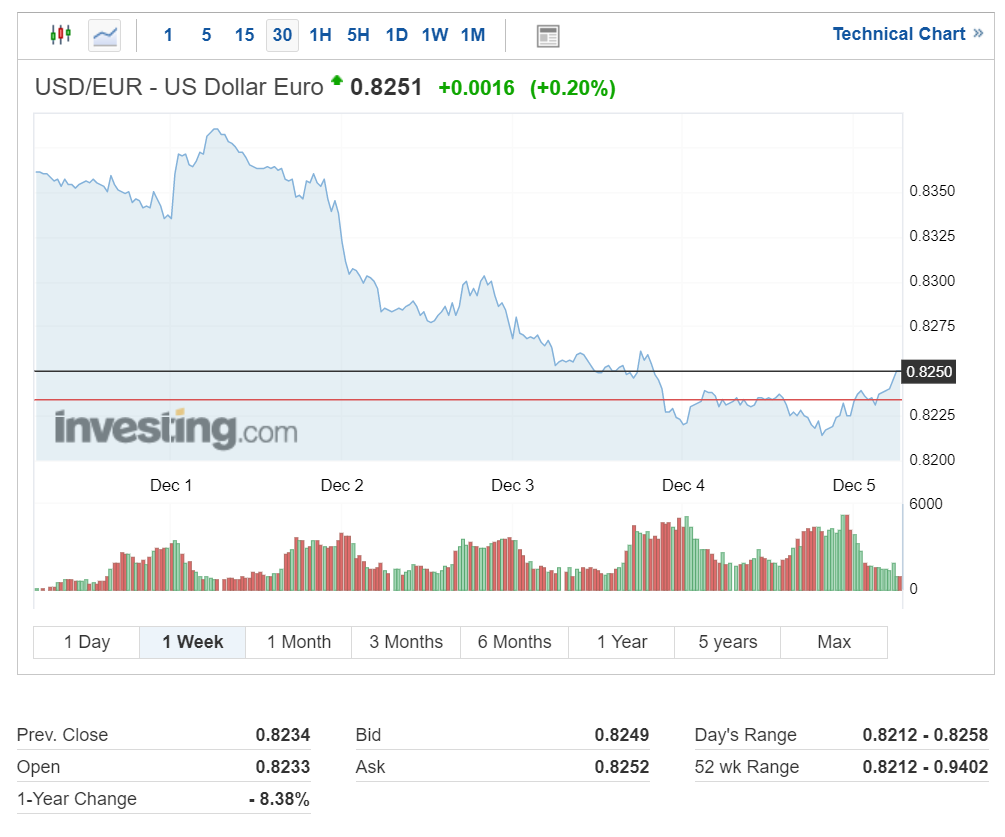 달러 대비 유로화 환율은 현재 1달러당 0.8251유로를 기록하고 있습니다.