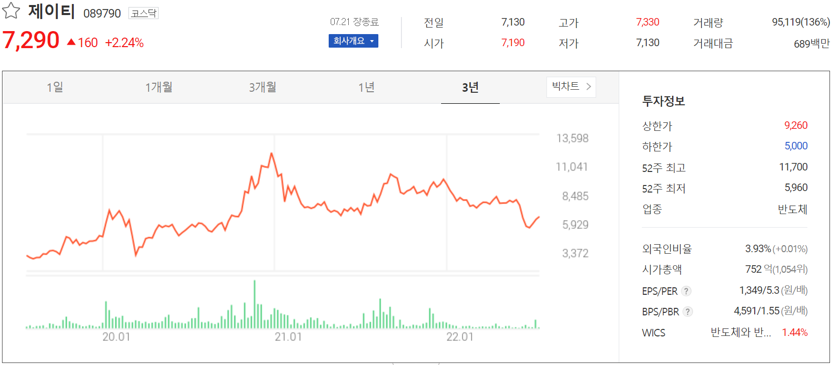 7월 21일 장 종료 기준 당사의 주가는 전일보다 2.24% 오른 7,290원에 거래를 마감했습니다. 외국인 비율은 3.93%이며, 시가총액 752억 원으로 코스닥 시총 기준 1054위 종목입니다.