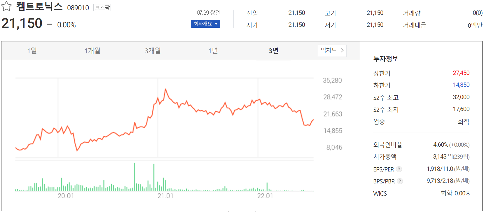 7월 28일 장 종료 기준 당사의 주가는 전일보다 2.92% 오른 21,150원에 거래를 마쳤습니다. 외국인 비중은 4.6%이며, 시가총액 3,143억 원으로 코스닥 시총 기준 239위 종목입니다.