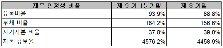 당사의 재무 안정성 비율에서는 유동비율 93.9%, 부채비율 164.2%, 자기자본비율 37.8%, 자본 유보율 4,576.2%를 기록했습니다. 중국 실적의 감소 추세에 따른 실적 부진으로 부채비율이 높은 편이나 감소 추세에 있으며, 실적 회복과 유럽, 북미 및 인도 시장의 실적 개선에 따른 재무상태도 개선될 것으로 보고 있습니다.