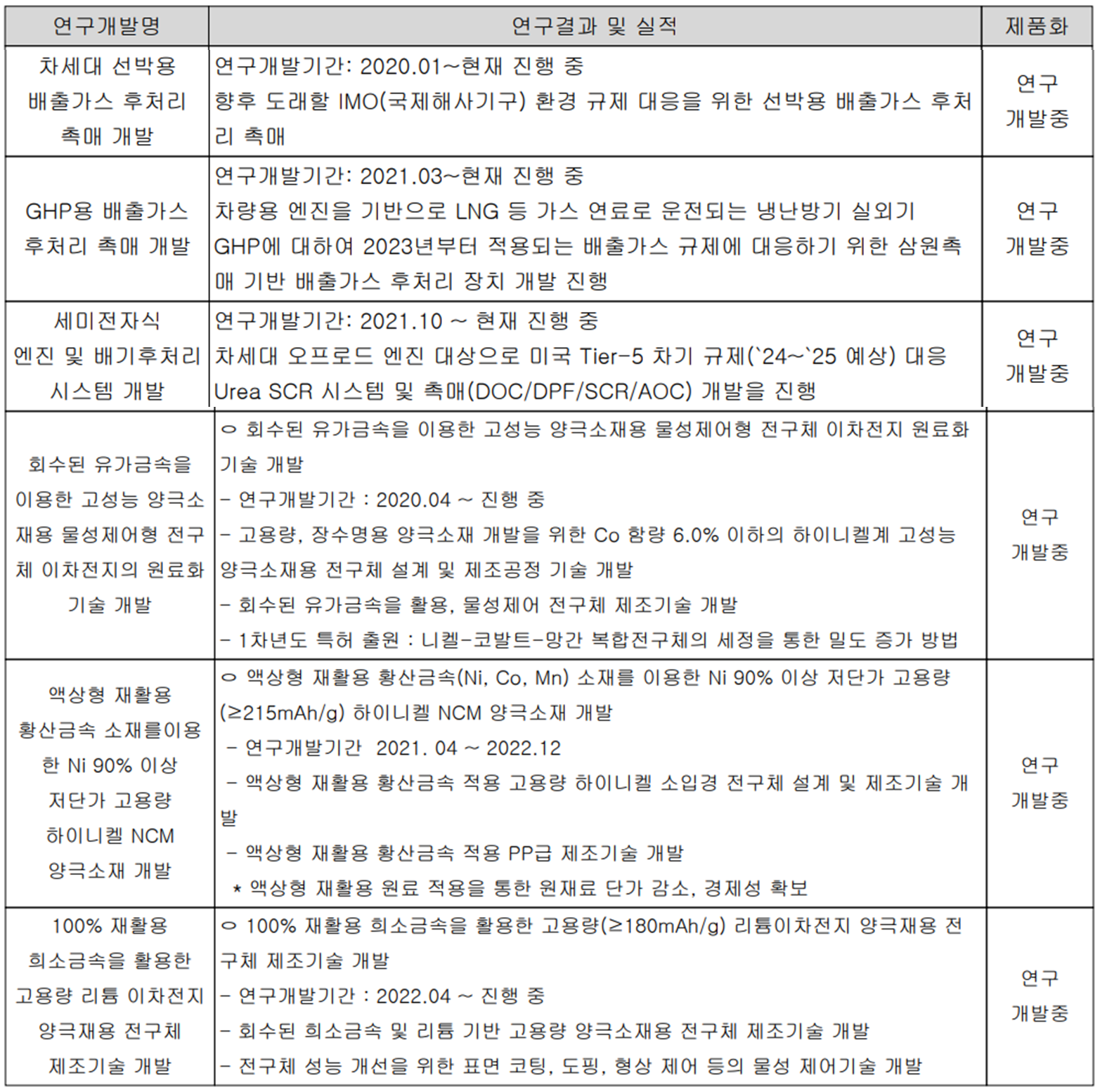 당사는 지난 상반기 매출액의 2.37%인 10억 원의 비용을 투자하면서 배출가스 저감용 촉매 및 이차전지 소재의 신제품 개발 및 개선에 대한 연구와 제조 공정의 공정 품질 개선 등 환경 개선을 위한 연구 개발 활동을 수행하고 있습니다.