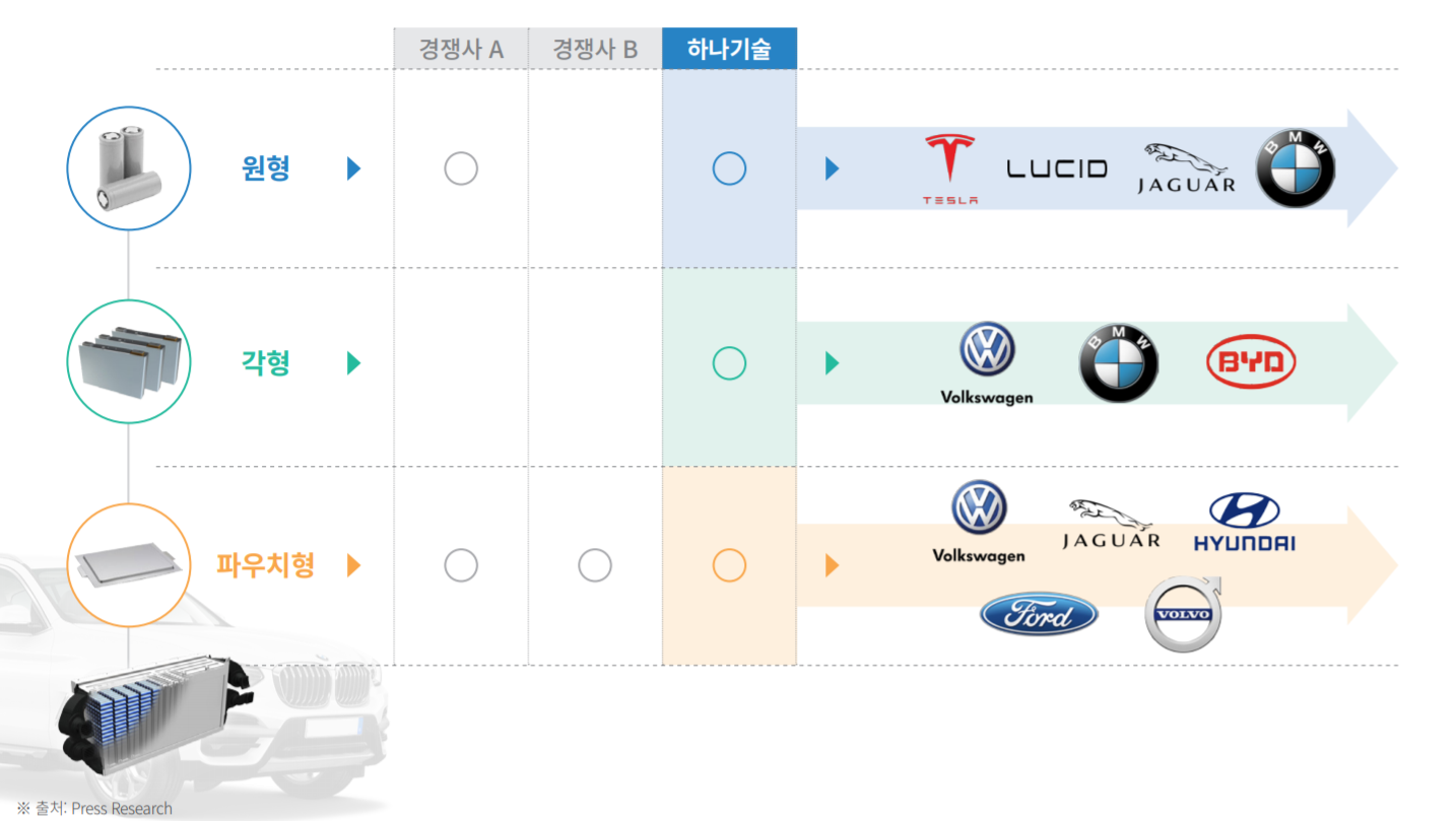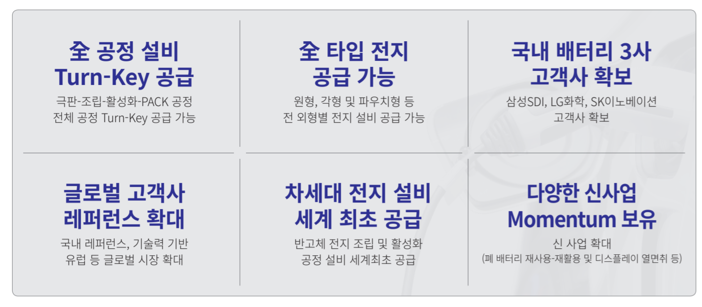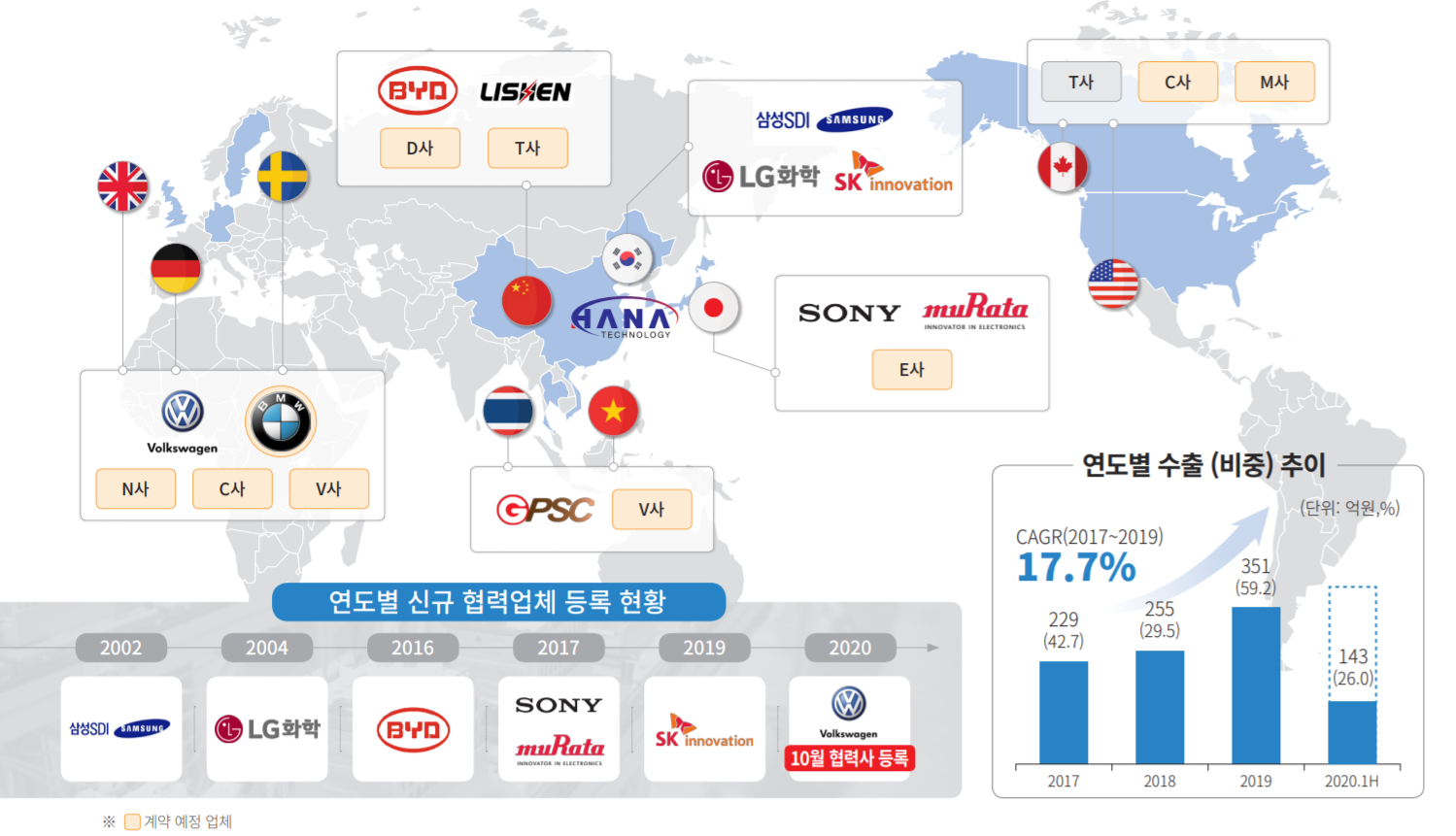 국내 배터리 3사는 물론 중국 BYD 및 일본의 소니, 무라타, 최근 유럽의 완성차 업체인 폭스바겐 협력사 등록 등을 통해 글로벌 시장 공략을 가속화하고 있습니다.