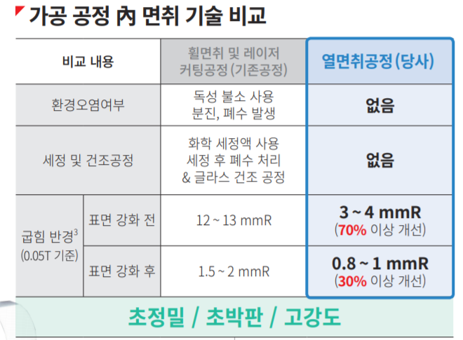 당사의 초박판 유리(UTG) 가공 기술인 열면취공정은 유리를 마이크론 단위로 정밀하게 깎아내는 기술로, 최근 삼성디스플레이와 0.05T UTG (Ultra Thin Glass)를 가공하여 1mm 굽힘 반경 테스트에 성공했고 현재 0.03T 두께의 UTG 열면취 가공 기술을 테스트 중에 있다고 합니다.