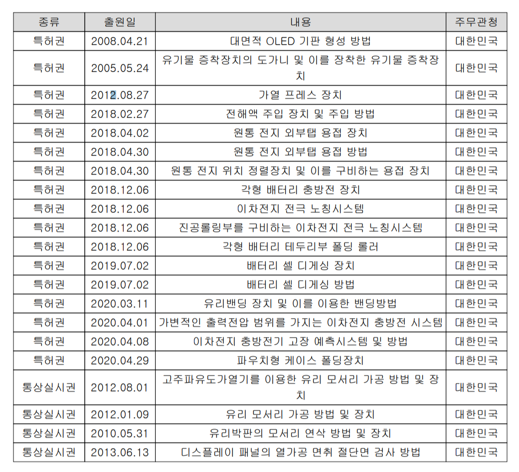 이중 4개 분야는 배터리 관련이고 다른 하나는 초박판 강화 유리(UTG)가공기술에 대한 부분인데 향후 폴더블 폰과 플렉시블 폰에 사용될 기술입니다. 아직 상용화까지는 2~3년 정도의 기간이 필요한 것으로 알고 있습니다.