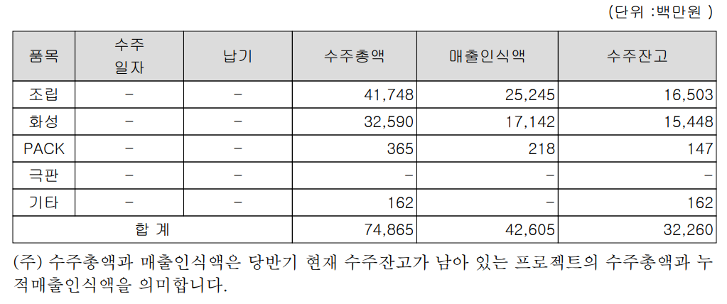 당사는 올해 상반기 기준 조립과 화성공정 장비의 매출이 전체 매출의 93.07%를 차지하고 있고 매출의 100%가 2차전지 사업에서 나오고 있습니다.