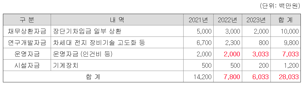 2020년 지수 상승의 한 축을 담당했던 2차전지 관련주가 주춤하던 11월 하나기술은 IPO에 성공하면서 11월 25일 코스닥 시장에 입성하게 되었습니다. 이로 인해 하나기술은 공모자금을 확보하게 되었고 아래는 자금 운용에 대한 당사의 세부계획입니다.