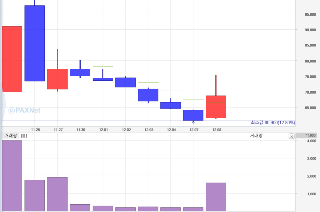 12월 8일 종가가 68,700원, 시가총액 2,222억원에 올해 순이익 추정치 91억을 감안하면 PER 24배 정도 됩니다. 성장주에 큰 의미 없는 수치일 수 있지만 작년 보다 올해 실적에 기반한 PER 수치 정도는 짚어본 후 투자에 임해야겠습니다. 그리고 이번 주에는 선물 옵션 동시만기 등 시장 변동성이 많은 시기라 조금더 지켜보는 것도 좋을 것 같습니다.
