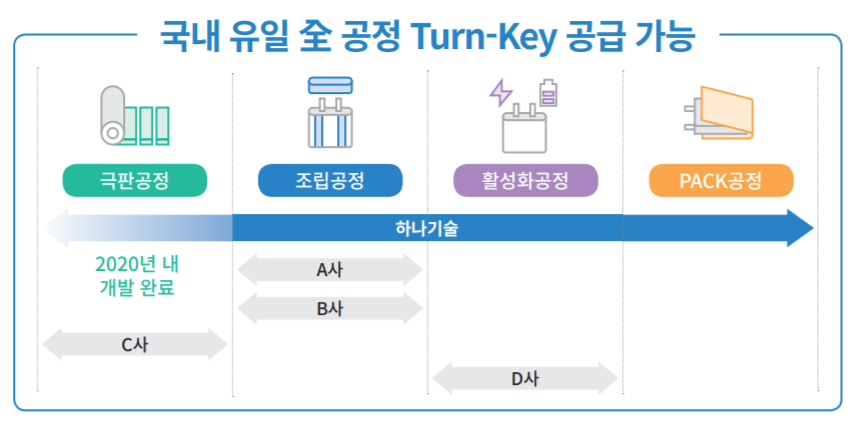 하나기술은 2차전지의 원형, 각형 및 파우치형 등 모든 형태의 전지 설비가 one-stop solution으로 제작 가능합니다. 국내 최대 장비 제작 CAPA를 가지고 있기 때문에 모든 라인을 동시 가동 시 매출 5천억 원 이상 가능하다고 합니다. 도한 당사의 전해액 주액기는 국내 최대 속도인 350ppm으로 특정 고객사에 독점 공급하는 등 그 기술력을 인정받고 있습니다.