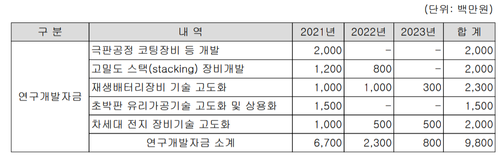 당사는 지난 IPO 당시 얻게된 공모자금 중 일부인 98억 원의 금액을 연구 개발 자금으로 사용한다고 밝혔습니다. 이중 4개 분야는 배터리 관련이고 다른 하나는 초박판 강화 유리(UTG) 가공기술에 대한 부분입니다.