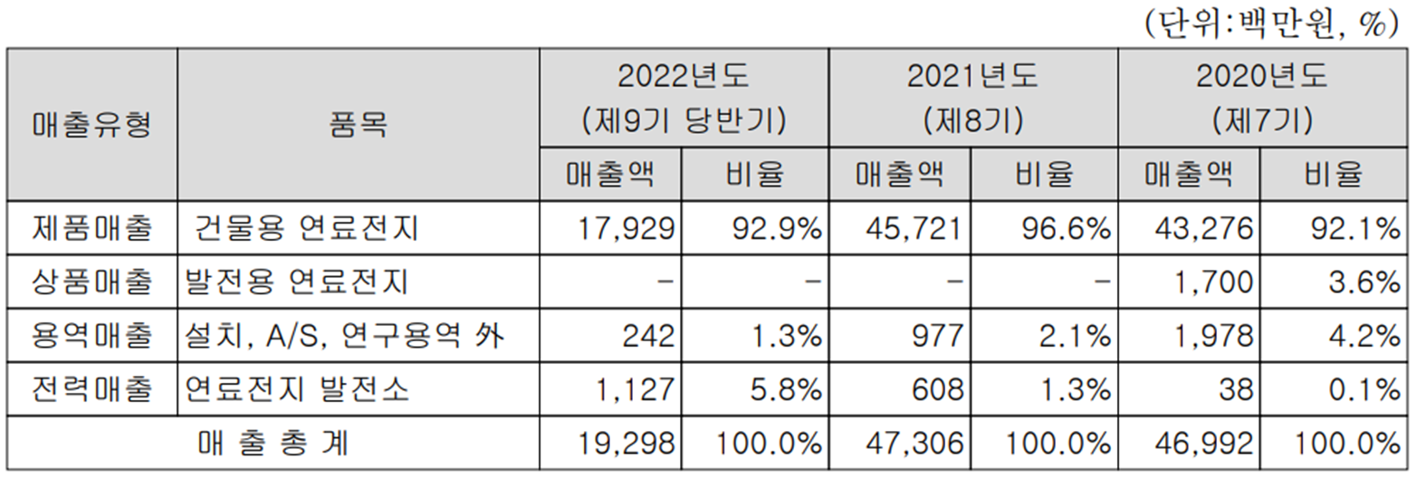 당사는 수소연료전지 전문 기업으로서 건물용 연료전지를 주력 사업으로 하고 있으며, 자회사를 통해 드론, UAV, 선박 등에 활용되는 연료전지 파워팩 사업을 추진하고 있습니다. 당사의 건물용 연료전지는 고분자 전해질막 연료전지(PEMFC)로서 발전용량에 따라 1KW급부터 50KW급까지 5개 제품 군으로 구성되어 있으며, 발전용 연료전지는 주로 발전용량이 1MW급 이상으로 구분됩니다.