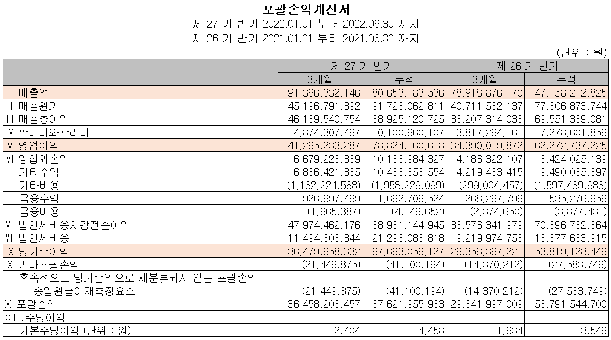 2022년 상반기 총자산은 전기보다 12.2%(567억) 늘어난 5,230억 원으로 매출채권 및 금융자산의 증가에 기인합니다. 부채총계는 55.5%(270억) 증가한 757억 원으로 기타채무(미지급)의 증가에 따릅니다. 자본총계는 7.1% 증가한 4,474억 원을 기록했습니다.