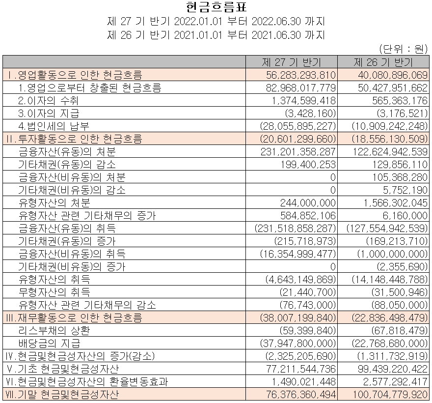 지난 상반기 영업활동 현금흐름에서는 당기순이익의 발생으로 563억 원의 현금이 유입되었으며, 투자활동에서는 금융자산(비유동)의 증가와 유무형 자산의 취득 등으로 206억 원이 유출되었습니다. 재무활동에서는 리스 부채의 상환과 배당금의 지급으로 380억 원이 유출되었습니다. 2022년 상반기 말 현재 당사가 확보하고 있는 현금은 764억 원으로 전년 동기 대비 24.2% 감소했습니다.