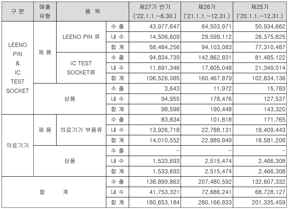 당사는 반도체 검사용 프로브(LEENO PIN 류)와 반도체 테스트 패키지용 장비의 소모성 부품인 IC TEST 소켓을 국산화하면서 다양한 반도체에 적용할 수 있는 소켓을 짧은 기간 내에 공급할 수 있는 생산 인프라를 구축하고 있습니다. 또한 LEENO PIN과 IC TEST SOCKET에서 축적된 기술력으로 의료기기용 초음파 프로브에 적용되는 부품을 개발, 공급하면서 초음파 진단기 시장에서 경쟁력을 확보하고 있습니다.