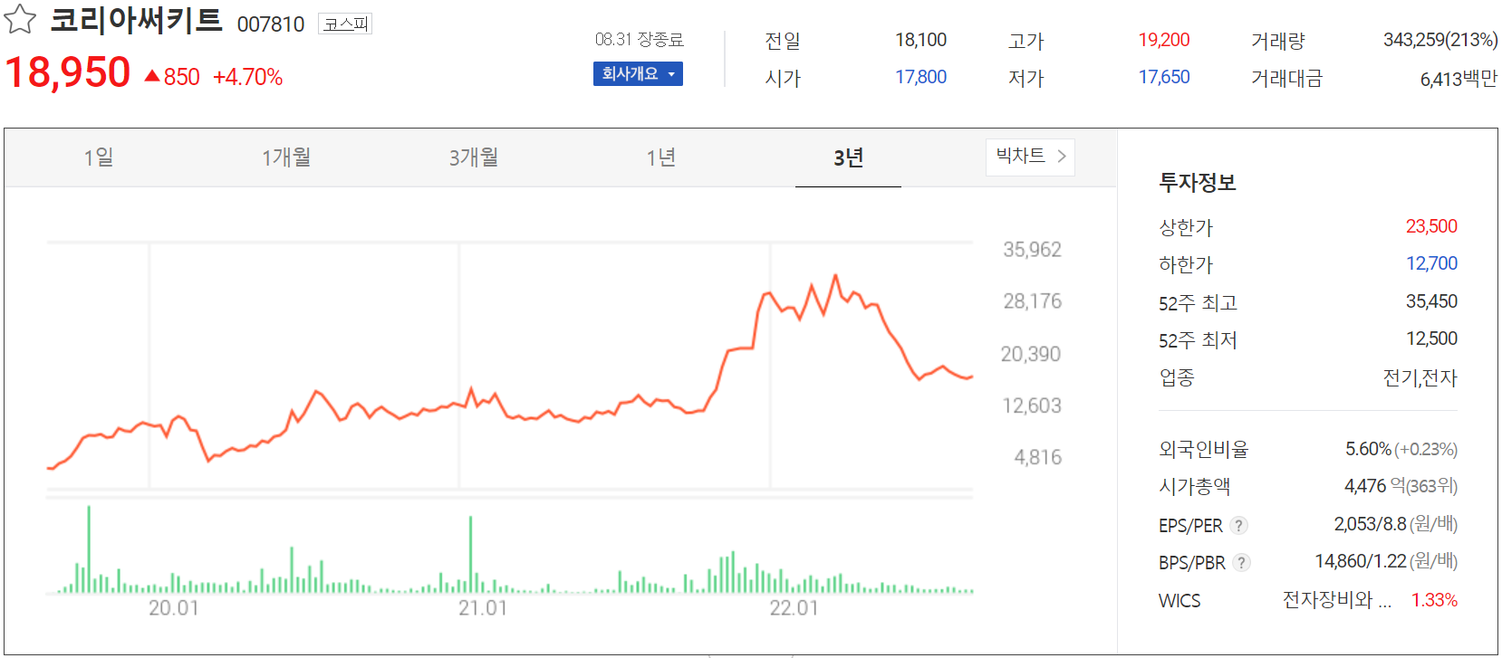 8월 31일 장 종료 기준 당사의 주가는 전일보다 4.7% 상승한 18,950원에 거래를 마쳤습니다. 외국인 비율은 5.6%이며, 시가총액 4,476억 원으로 코스피 시총 기준 363위 종목입니다.