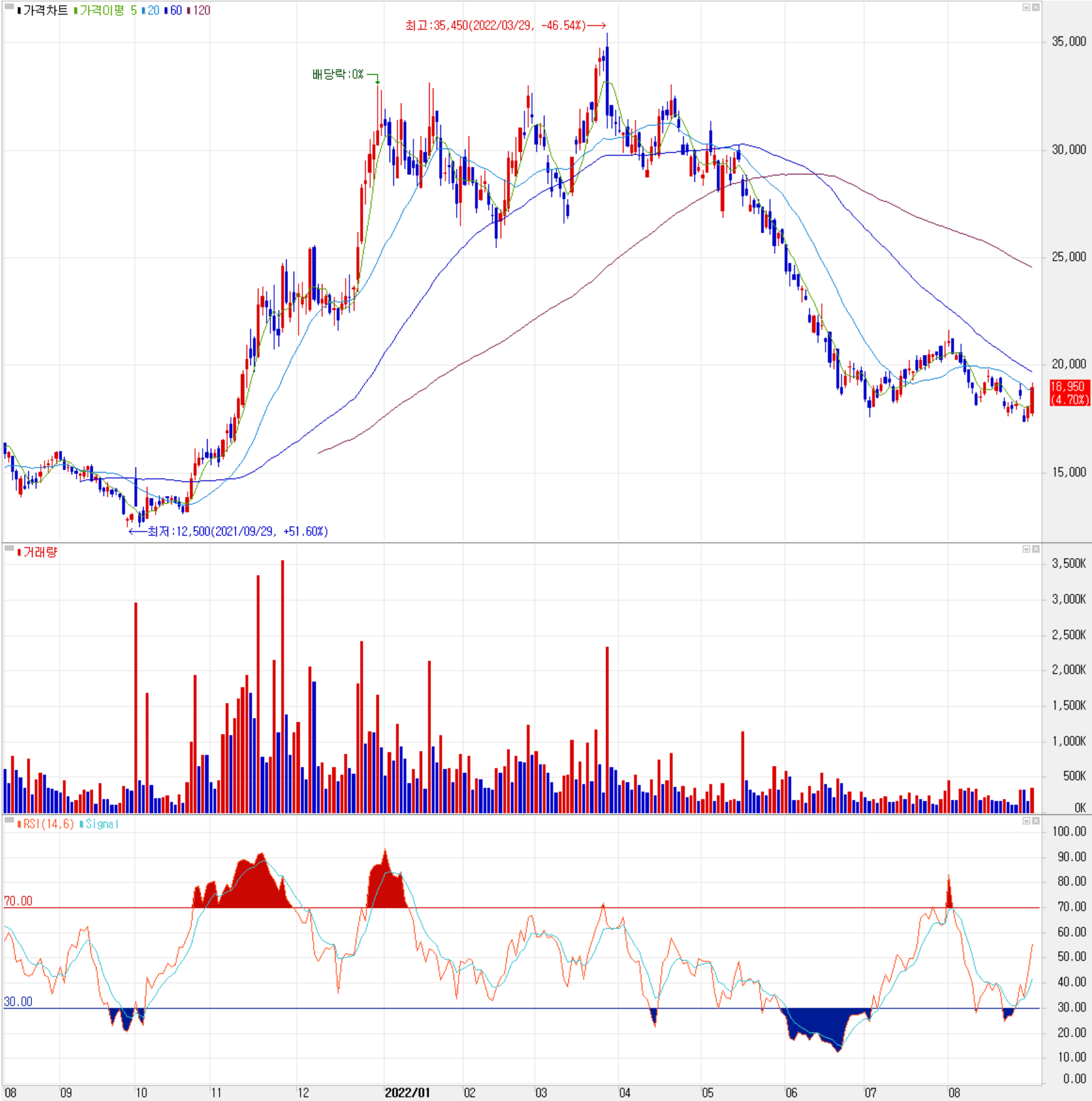 올해 들어서면서 3만 원 부근에서 변동성을 보이던 당사의 주가는 금리 인상과 인플레이션 우려 등 시장 불확실성이 확대되면서 급락하여 최근에는 1만 원대 후반에서 거래가 형성되고 있습니다. 지난 2분기에는 기관의 매도로 하락세를 이끌었으며, 최근 수급에서는 기관의 계속되는 매도세에 개인이 매수로 대응하는 모습입니다. 예상 실적, 투자 포인트 및 차트 소견을 종합한 개인적인 목표주가는 28,000원으로 설정하였습니다.