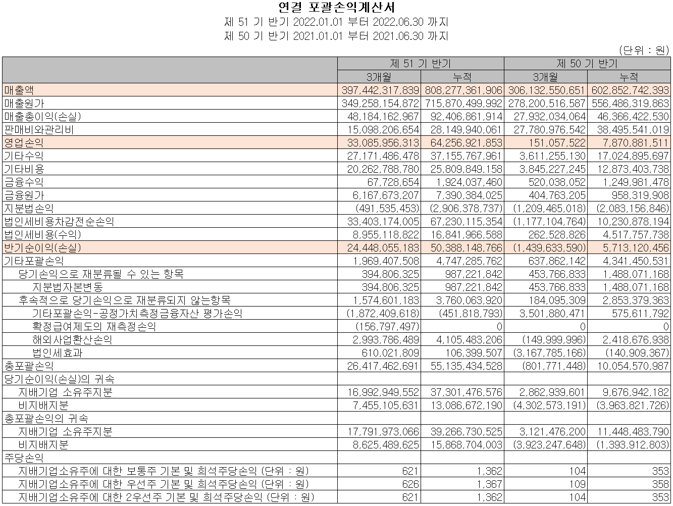 2분기 매출액은 3,974억 원으로 전년 동기 대비 29.8% 증가했고, 상반기 누적 매출은 8,083억 원으로 34.1% 증가했습니다. 영업이익은 2분기에는 331억 원으로 21,802.9%, 누적 기준으로는 643억 원으로 716.4% 증가했습니다. PCB 부문은 19.2% 증가했고, 반도체 부문은 202% 증가하면서 전사 실적을 견인했습니다.