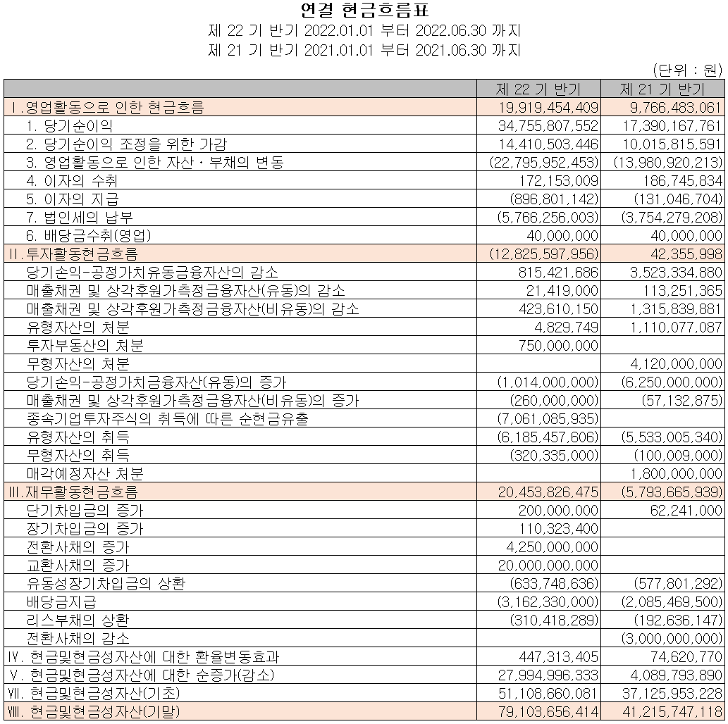 지난 상반기 영업활동 현금흐름에서는 199억 원의 현금이 유입되었으며, 투자활동에서는 유무형 자산의 취득, 종속기업 투자주식의 취득 등으로 128억 원의 현금이 유출되었습니다. 재무활동에서는 당기 부채를 상환하고 배당금을 지급하면서 유출이 있었으나, 차입금 및 사채의 증가로 205억 원이 유입되었습니다. 2022년 상반기 말 현재 당사가 확보하고 있는 현금은 791억 원으로 전년 동기 대비 91.9% 증가했습니다.