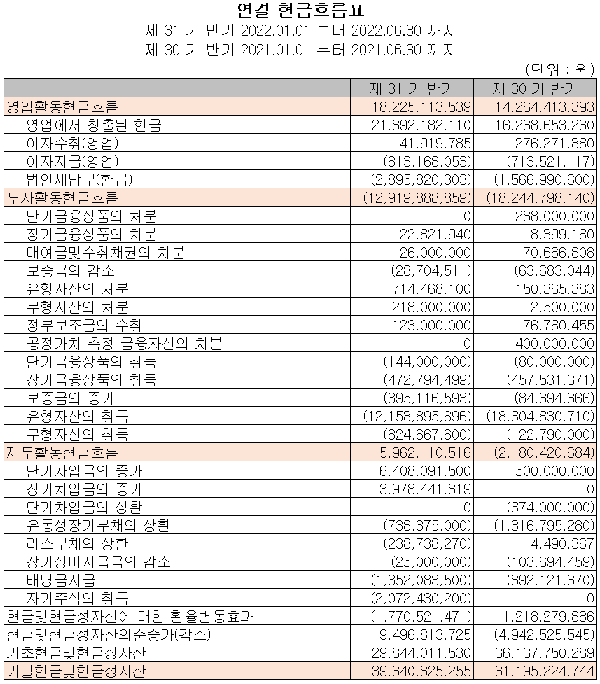 지난 상반기 영업활동 현금흐름에서는 182억 원의 현금이 유입되었으며, 투자활동에서는 유무형 자산과 금융상품의 취득 등으로 129억 원이 유출되었습니다. 재무활동에서는 당기 부채를 상환하고 배당금을 지급하면서 유출이 있었고 차입금의 차입을 통해 총 60억 원이 유입되었습니다. 2022년 상반기 말 현재 당사가 확보하고 있는 현금은 393억 원으로 전년 동기 대비 26.1% 증가했습니다.