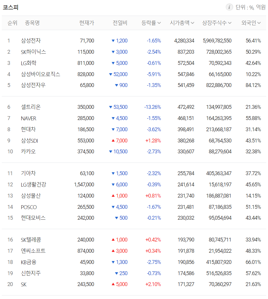 오늘 코스피에서 외국인 순매수 상위종목은 LG전자, 삼성SDI, 아모레퍼시픽, 신풍제약, 신한지주, 기아차 등이었고 순매도 상위 종목에는 삼성전자, 셀트리온, 현대차, 카카오, 삼성바이오로직스 등이 이름을 올렸습니다. 기관의 경우 LG전자, SK, 삼성바이오로직스, 삼성SDI, HDC현대산업개발 등을 순매수했고 반면 삼성전자, SK하이닉스, 롯데케미칼, KB금융, 기아차, 카카오 등을 순매도했습니다.