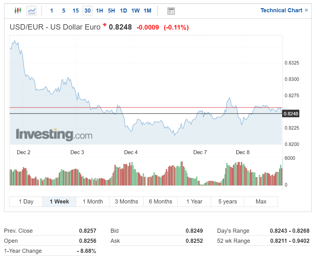 유로 환율은 소폭 상승 중이며 현재 1달러당 0.8248유로를 기록 중입니다.
