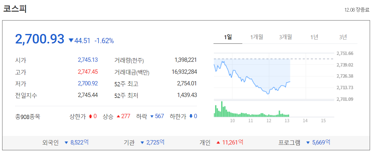 오늘 코스피는 어제 보다 44.51포인트(1.62%) 내린 2700.93에 장을 마감했습니다. 장 시작부터 갭하락 출발을 했으며 오늘의 하락은 다가오는 선물 옵션 동시만기, 연말 그리고 지난 급등에 따른 차익실현 매물 등이 뒤섞이지 않았나 싶습니다. 코로나19 재확산 문제도 단기적 변동성이 요인이 되었습니다.