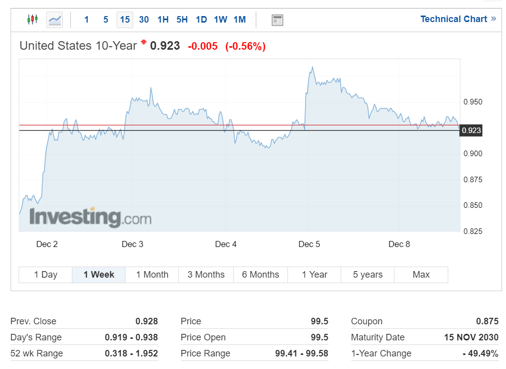 코로나19 급증으로 인한 안전자산 선호 심리로 채권 가격이 상승하면서 미국 10년 만기 국채 수익률은 현재 0.923%를 기록하며 소폭 하락 중입니다.