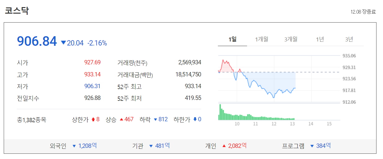 수급면에서는 외국인과 기관이 각각 1208억, 481억 원어치 순매도했으며, 개인이 홀로 2082억 원어치 받아냈습니다.