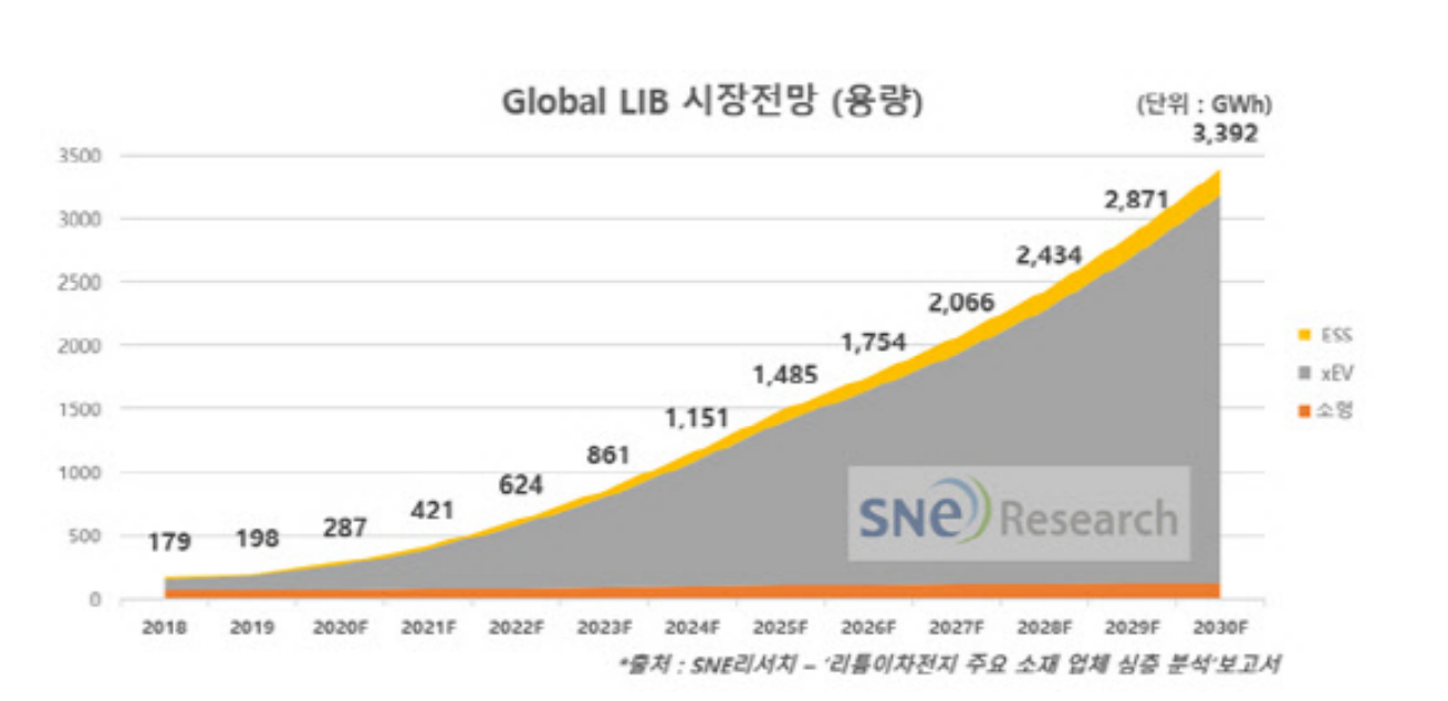 현재 전세계에서 소비되는 전지 가운데 2차전지가 차지하는 비율은 30% 정도지만, 친환경 정책의 강화로 한번 사용하고 폐기되는 1차전지의 사용은 줄어들고 2차전지의 사용량은 계속 증가하여 70%까지 확대될 전망입니다. 에너지 시장조사 전문업체인 SNE리서치에 따르면, 2020년 추정치인 287 Gwh에서 2025년 전망치인 1,485 Gwh 까지만 하더라도 무려 5배에 가까운 성장이 예측됩니다.