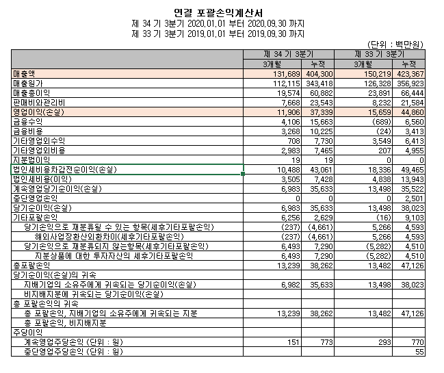 지난 3분기 손익계산서입니다. 3분기 매출은 1316억 원으로 전년 동기 대비 12% 감소했고, 영업이익은 119억 원을 달성하여 24% 정도 감소했습니다.