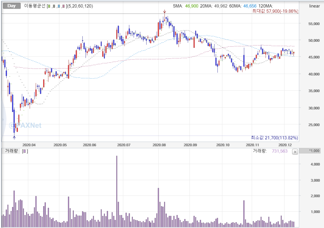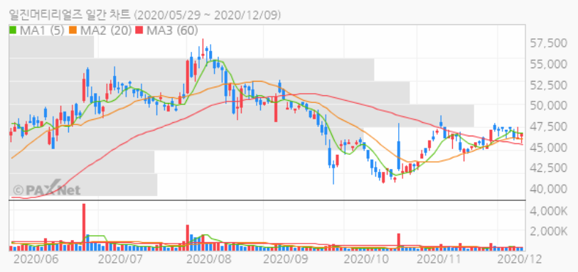 최근 2차전지 종목 군의 전반적인 조정 장세도 있었지만, 주가의 흐름에 일진머티리얼즈의 실적이 반영되는 모습입니다. 12월 9일 종가 46,400원인데 상승여력이 크지 않아 보입니다. 2020년 실적추정치로 영업이익 547억, 시가총액 2초 1395억원 대략 PER 39배입니다.