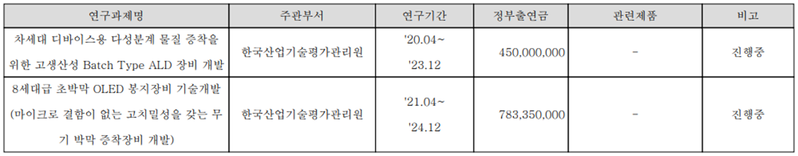 당사는 지난 상반기 매출액의 3.52%인 16억 원을 투자하면서 차세대 배치 타입 ALD에 적용되는 전구체, 초박막 OLED 봉지 장비용 전구체 등의 정부과제를 수행하고 있습니다.