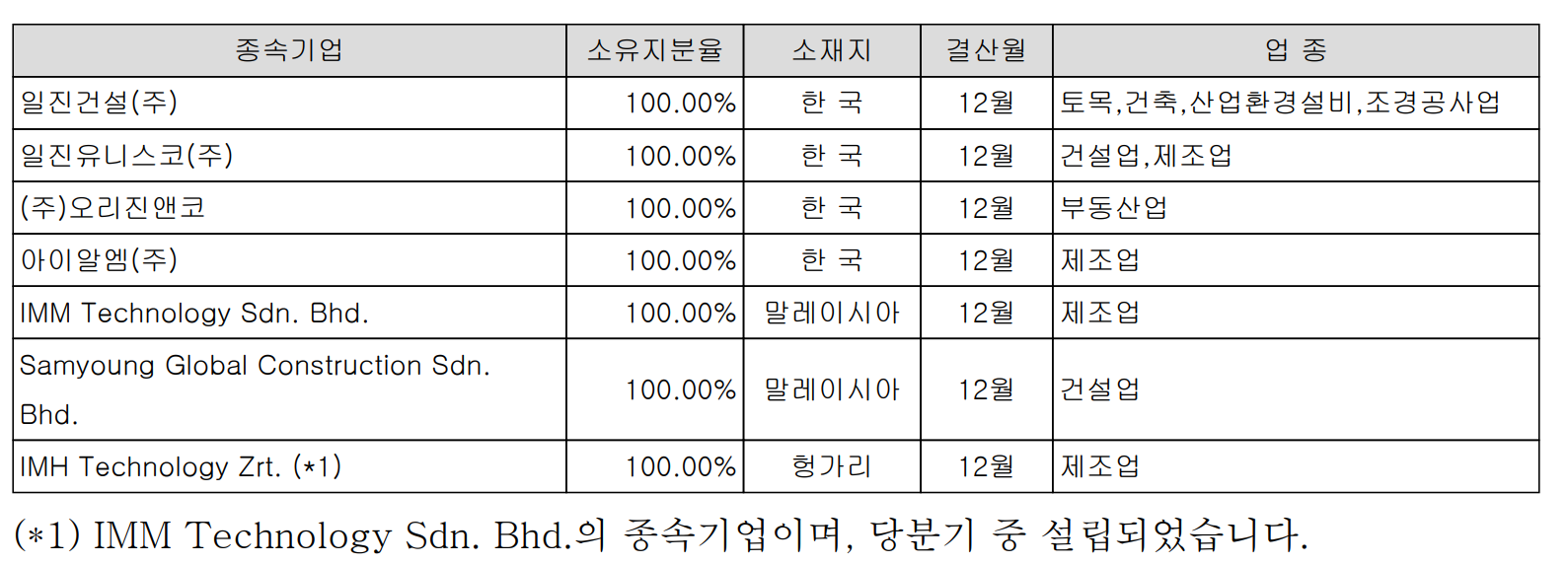 종속회사에는 일진건설, 일진유니스코, 오리진엔코, 아이알엠, IMM, Samyoung Global construction, IMH technology 등이 있습니다.