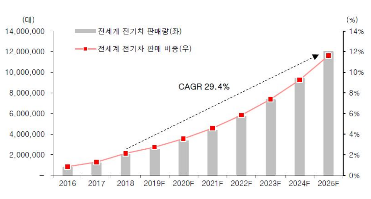 상기 연구 자료에 의하면 글로벌 전기차 시장은 2018년부터 2025년 사이 연평균 29.4% 성장할 것으로 보고 있습니다. 연구자료는 성장의 이유로 유럽의 배출가스 규제와 판매량 호조, 글로벌 완성차 업체들의 판매 목표, 배터리 가격 하락 및 탄소중립과 글로벌 친환경 정책을 들었습니다.