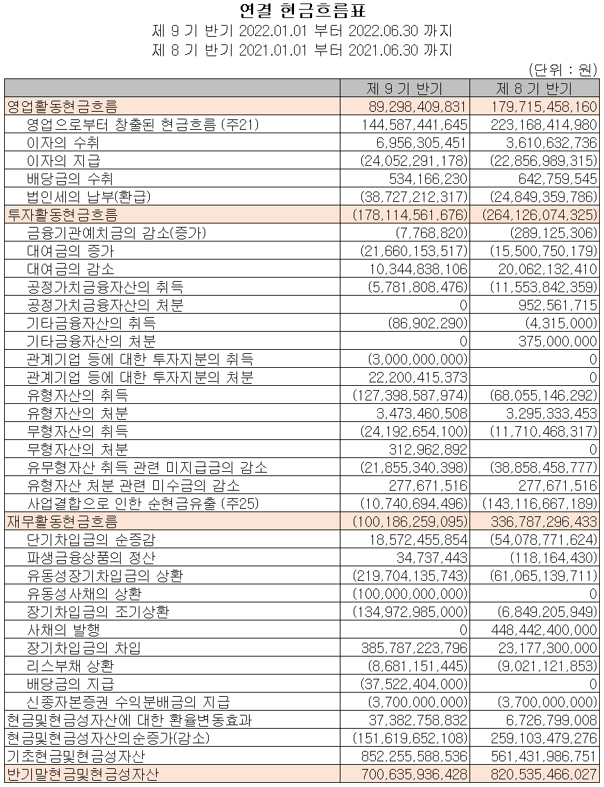지난 상반기 영업활동 현금흐름에서는 893억 원의 현금이 유입되었으며, 투자활동에서는 유무형 자산의 취득과 대여금의 증가 등으로 1,781억 원이 유출되었습니다. 재무활동에서는 당기 부채를 상환하고 배당금을 지급하면서 1,002억 원이 유출되었습니다. 2022년 상반기 말 기준 당사가 확보하고 있는 현금은 7,006억 원으로 전년 동기 대비 14.6% 감소했습니다.