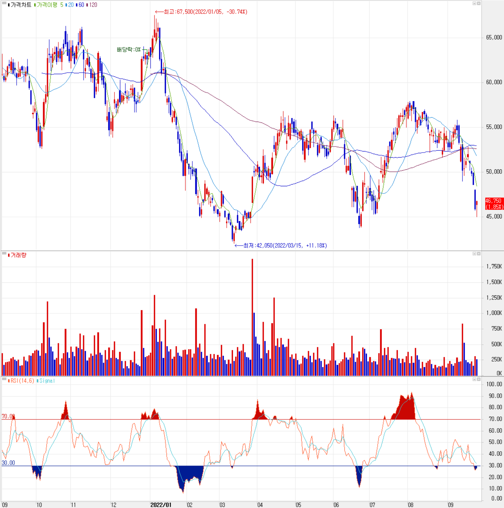 9월 27일 장 종료 기준 당사의 주가는 전일보다 1.85% 오른 46,750원에 거래를 마쳤습니다. 외국인 비율은 21.27%이며, 시가총액 2조 1,952억 원으로 코스피 시총 기준 119위 종목입니다.