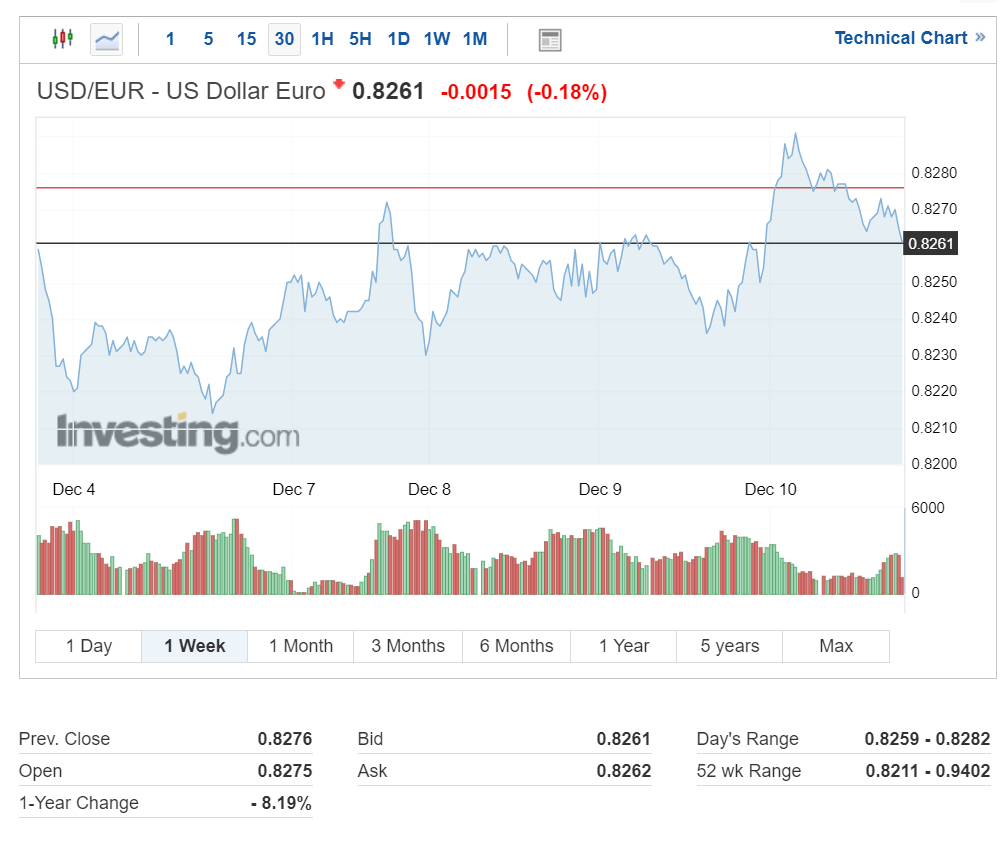 달러 대비 유로 환율은 현재 1달러당 0.8261유로를 기록 중입니다.